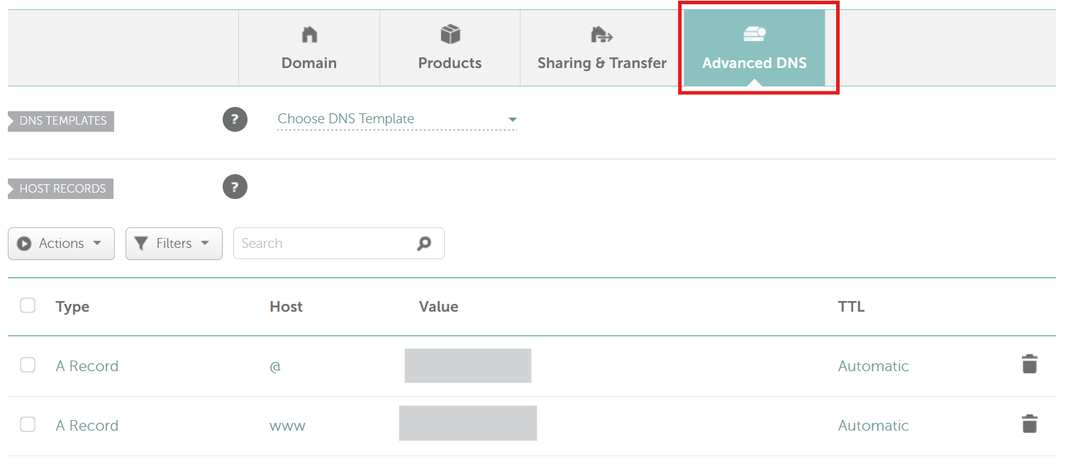 You’ll want to go to the DNS settings from the the domain management screen, and make sure there are 2 A records: “@” and “www” both pointing to your VPS IP (in the “Value” field, greyed out below). If you need to add a DNS record just click “+Add new record”. But this is what you want to end up with: